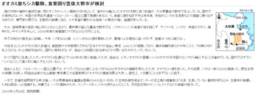 high190です。 大分県豊後大野市ではシカやイノシシによる相次ぐ農作物被害に対し、海外からオオカミを輸入して駆除する策を検討しているそうです。 オオカミ放ちシカ駆除、食害困り豊後大野市が検討(出典:読売新聞 2010/12/29) 畑の作物や植林の樹皮を食…