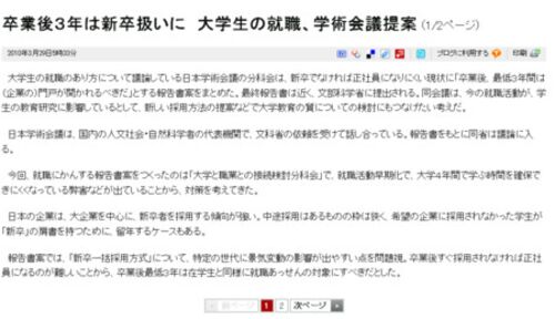 high190です。 大学生の就職のあり方について議論している日本学術会議分科会で「卒業後最低3年間は新卒扱いに」という提案を文部科学省にするそうです。 卒業後3年は新卒扱いに 大学生の就職、学術会議提案(出典:朝日新聞 2010/03/29) 大学生の就職のあ…