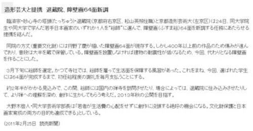 high190です。 京都芸術造形大学では、大学院生及び卒業生の中からふすま絵の絵師を1名選んで右京区にある妙心寺退蔵院のふすま絵を新調するプロジェクトをスタートさせるようです。 若手育成へ“専属絵師”…京都(出典:読売新聞 2011/02/25) 臨済宗・妙心寺…
