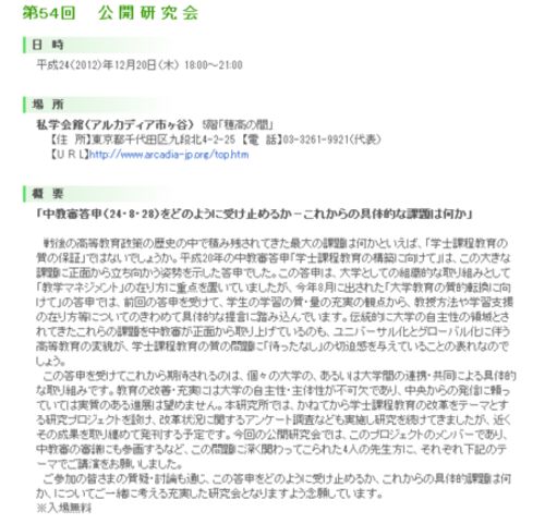 high190です。 12月20日(木)に日本私立大学協会附置私学高等教育研究所主催の公開研究会、「中教審答申(24・8・28)をどのように受け止めるか−これからの具体的な課題は何か」 に参加してきました。今年の8月28日に公表された「新たな未来を築くための大…